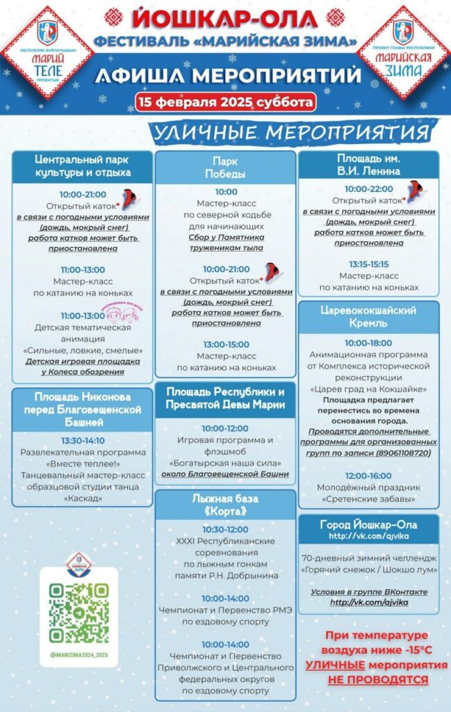 Отметим, что если на улице похолодает до -15 градусов, уличные мероприятия фестиваля будут отменены, сообщает пресс-служба мэрии Йошкар-Олы.