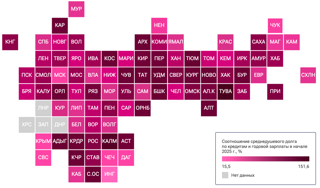 По данным на январь 2025 года, соотношение среднедушевого долга по кредитам и годовой зарплаты составляет 54,1%. В среднем объем задолженности перед банками на одного жителя Марий Эл составляет 330,9 тысяч рублей.