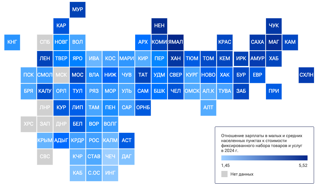 По данным аналитиков РИА Новости, в 2024 году отношение зарплаты в малых и средних населенных пунктах к стоимости фиксированного набора товаров и услуг составило 2,50. Средний заработок по итогам прошлого года составил 49,9 тысяч рублей.