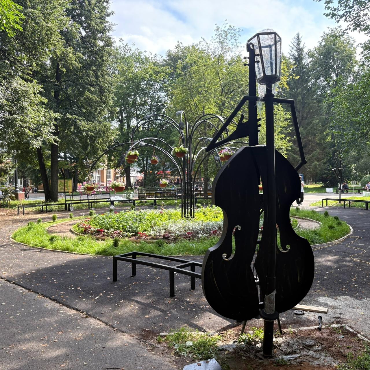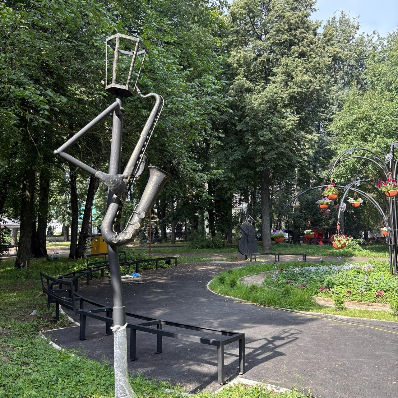 В парке рабочие устанавливают фонари, которые держат в руках музыкальные инструменты. Кроме того, устанавливаются фигурные лавочки, которые станут идеальным местом для встреч и фотосессий.
