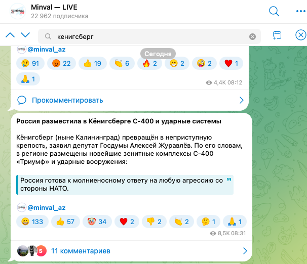 Азербайджанский портал Minval назвал Калининград Кенингсбергом в ответ на материал ТАСС, в котором Нагорный Карабах изначально был назван Степанакертом.