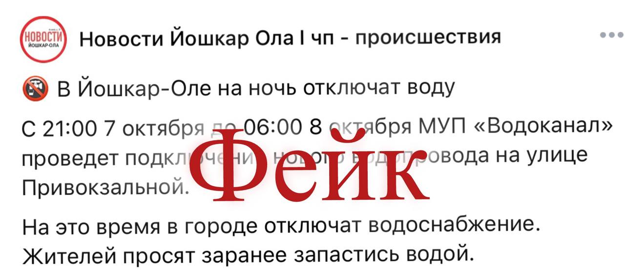 Сообщается, что якобы с 7 по 8 октября на улице Привокзальная будут подключать новый водопровод, из-за чего в городе будет отключена вода. В мэрии Йошкар-Олы и МУП «Водоканал» опровергли это сообщение, заявив, что подача воды в столице осуществляется в режиме 24/7.