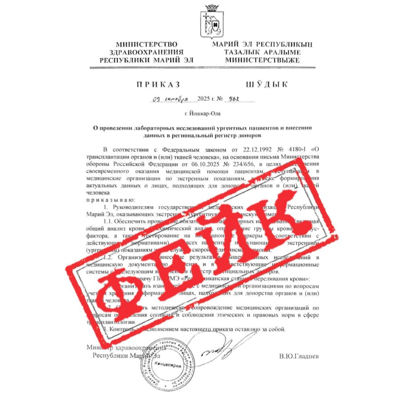 Согласно «документу», это приказ №962 «О проведении лабораторных исследований ургентных пациентов и внесении данных в региональный регистр доноров». Чтобы жители республики поверили, он «подписан» министром здравоохранения республики Владимиром Гладневым.
