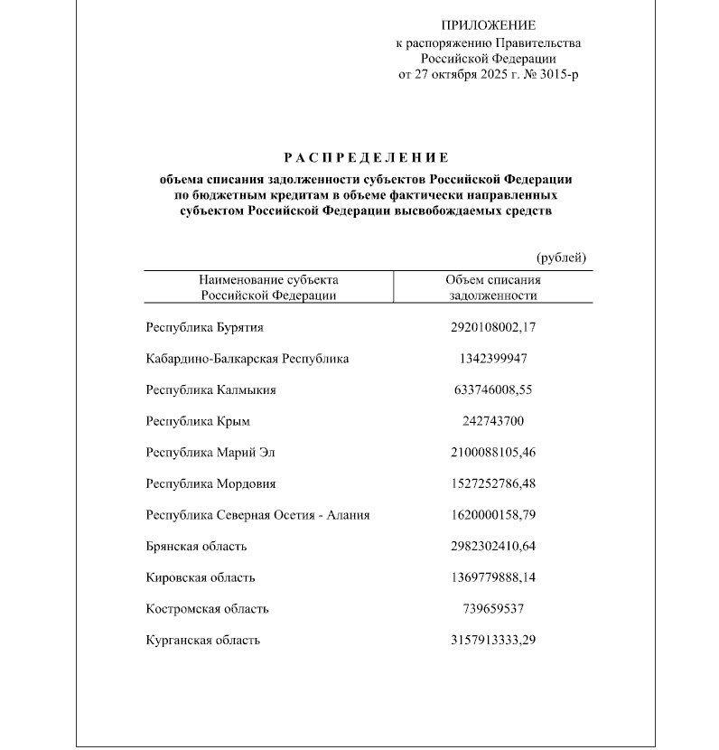 Общая списанная сумма задолженности регионов составила более 26 миллиардов рублей. Согласно распоряжению правительства страны от 27 октября 2025 года Nº 3015-р, которое подписал премьер-министр РФ Михаил Мишустин, Марий Эл списали 2 100 088 105,46 рублей.