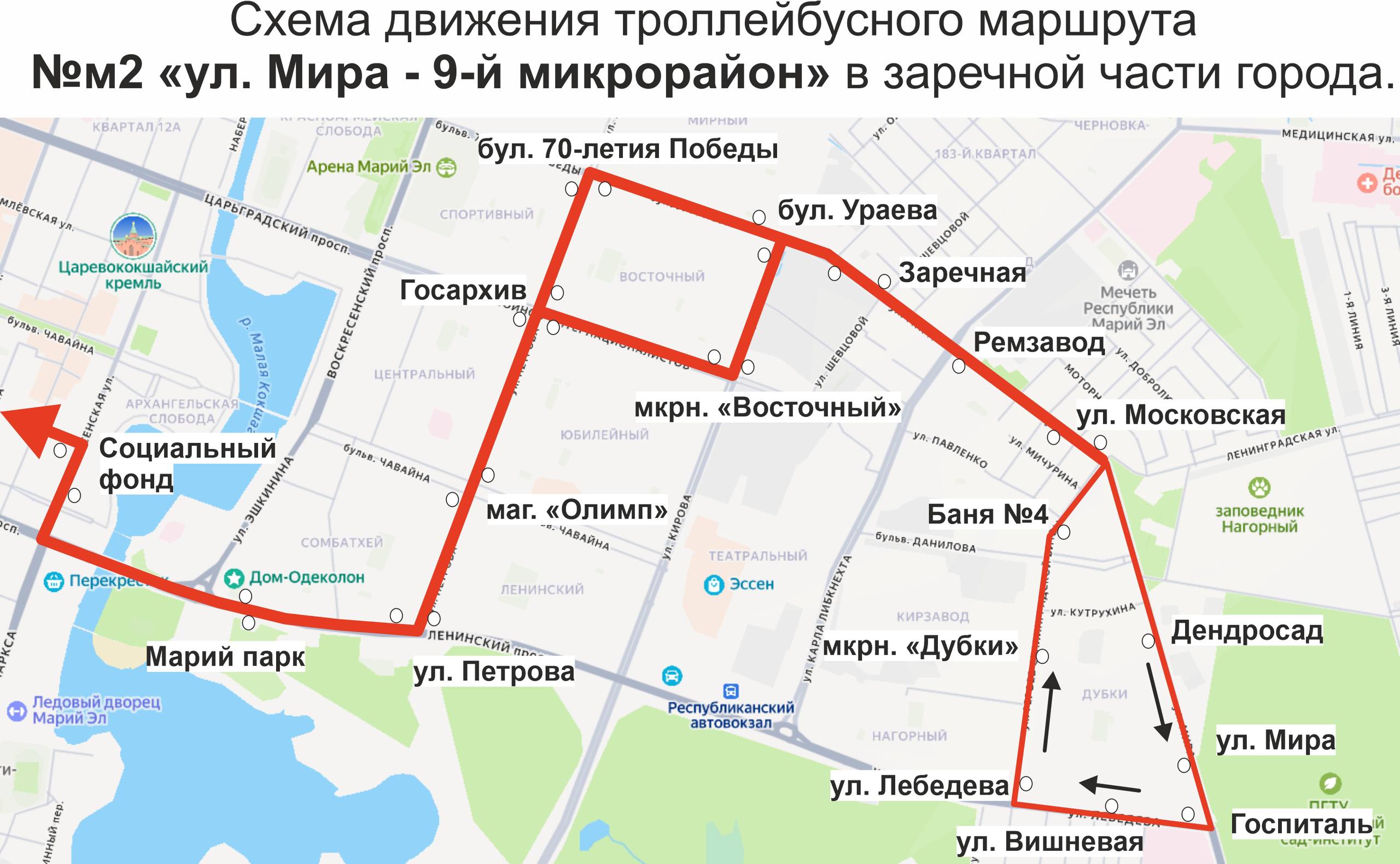 В ГУП «ТТ» сообщили, что с 11 ноября маршрут троллейбуса М2 изменится. Он больше не будет проезжать по улице Эшкинина и Воскресенскому проспекту.