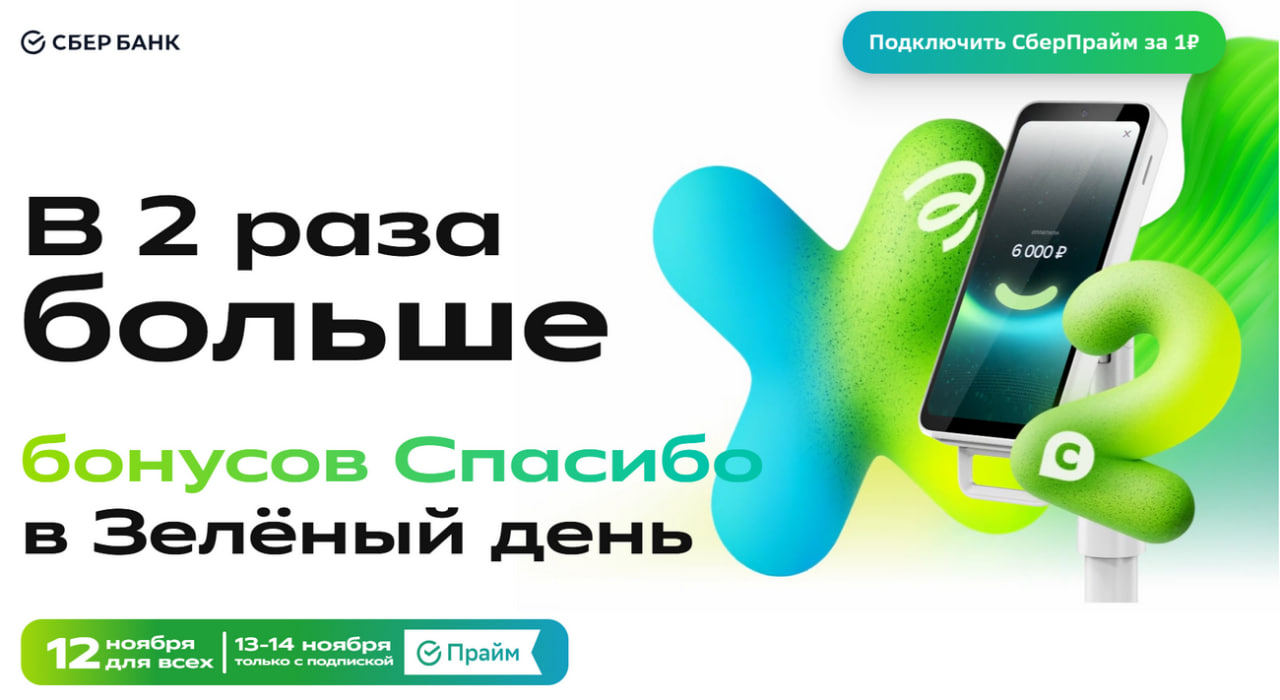 В Зелёный день, который приурочен ко дню рождения Сбербанка и пройдёт 12 ноября, покупки со Сбером станут вдвойне выгодными. Механика акции максимально простая и честная – банк удвоит количество бонусов с каждой покупки в категориях, которые клиенты подключили в программе лояльности.