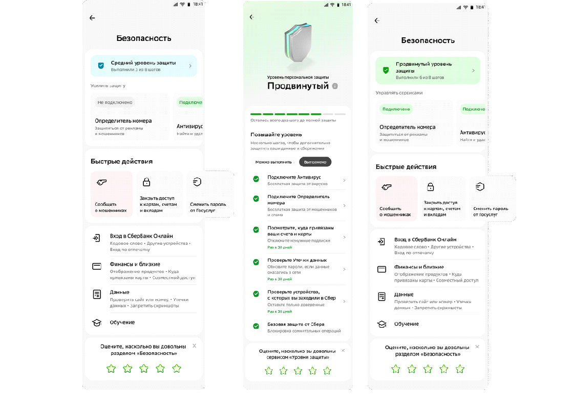 В разделе «Безопасность» мобильного приложения отображается текущий уровень киберзащиты пользователя: базовый, средний или продвинутый. При этом точка отправления – это антифрод-защита банка, которая является одной из самых надёжных в мире и по умолчанию защищает всех клиентов. На дальнейшее повышение уровня влияет выполнение практических заданий. Чтобы получить средний уровень, нужно выполнить от двух до четырёх заданий, продвинутый – пять и более пунктов из списка.