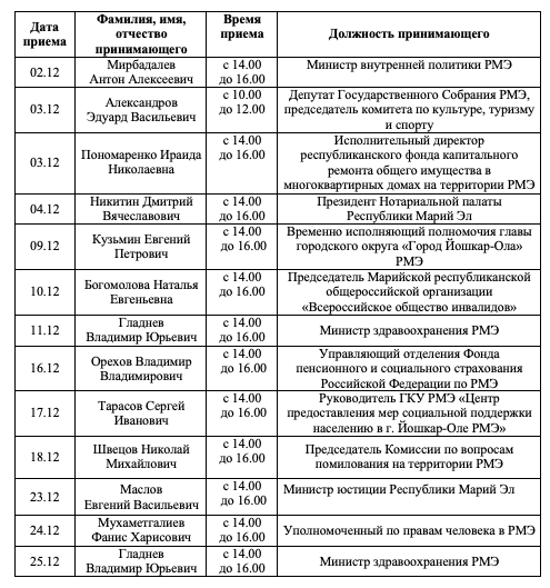 Напоминаем, как жителей Марий Эл буду принимать чиновники в предстоящем декабре 2025 года.