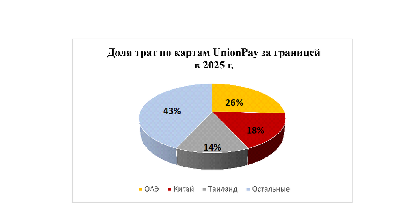 Аналитики Россельхозбанка выделили три страны-лидера по общему объему трат по картам UnionPay за 2025 году за рубежом. Первую строчку занимают Объединенные Арабские Эмираты, что составляет 26% от общего объема трат (43%), на втором месте – Китай (18%) и на третьем — Таиланд (14%). На эти три государства приходится более половины всех зарубежных расходов россиян.