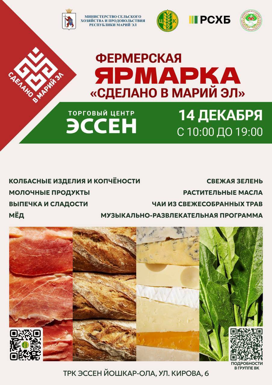 В преддверии Нового года Министерство сельского хозяйства и продовольствия Республики Марий Эл, Россельхозбанк, Центр компетенций в сфере сельхозкооперации и поддержки фермеров в Республике Марий Эл и Марийская ассоциация крестьянских (фермерских) хозяйств приглашают жителей Йошкар-Олы на фермерскую ярмарку «Сделано в Марий Эл», которая впервые будет проходить 14 декабря 2025 года в ТРК «ЭССЕН» (г. Йошкар-Ола, ул.Кирова, д. 6).