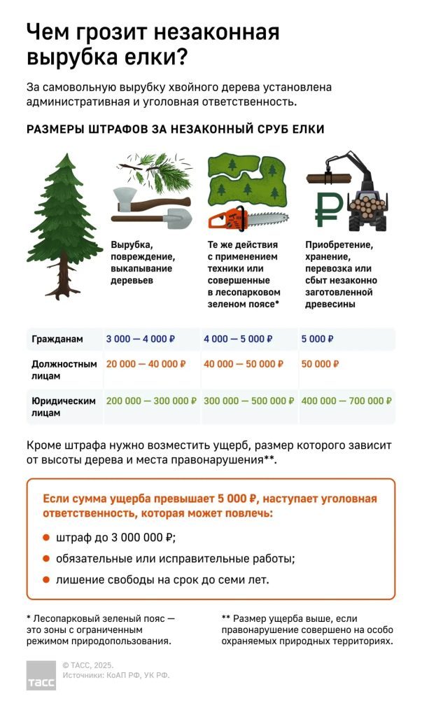 Тем, кто решится срубить в лесу елочку, грозит лишение свободы сроком до 7 лет. Предусмотрена административная ответственность, которая применяется, если сумма ущерба не превышает 5 тысяч рублей. А значит нарушителю грозит штраф в размере от 3 до 4 тысяч рублей, с обязательной конфискацией вырубленного дерева или веток, а также инструментов, использованных при вырубке.