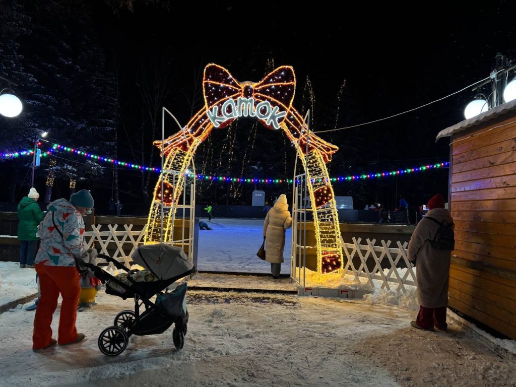 Для катающихся включают новогоднюю музыку, а заметить каток можно по иллюминации в виде больших коньков.