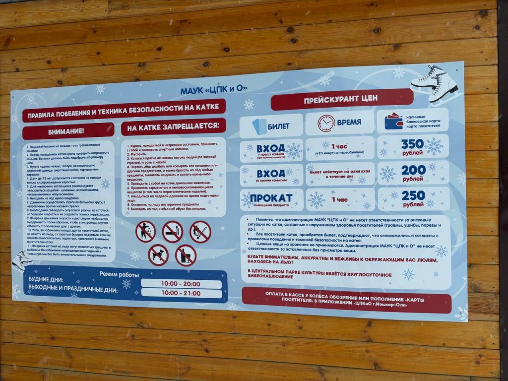 Далее в списке – каток в Парке Победы. Рядом с кассой висит объявление, что с 27 декабря по 11 января каток работает с 10 утра до 22 часов вечера.