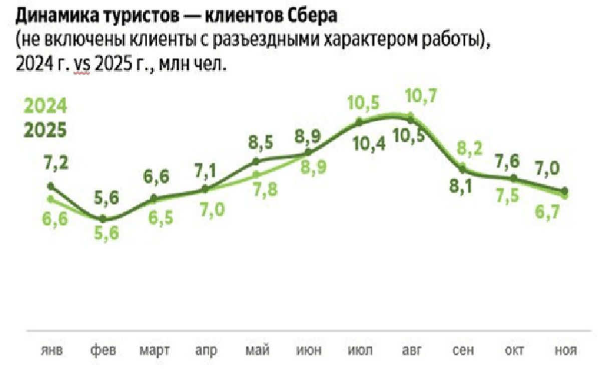 Как показало исследование, число внутренних туристов – клиентов Сбера в 2025 году выросло на 1%. Пик сезона пришёлся на июль и август, а Москва, Санкт-Петербург и Сочи сохранили статус главных точек притяжения.