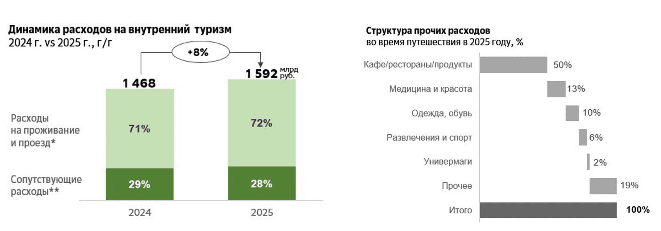 Общие потребительские расходы на внутренний туризм по данным Сбера увеличились за год на 8%. Номинальные траты одного туриста возросли на 7%, а реальные (с учётом инфляции) – на 2%. Люди стали тратить больше на кафе и продукты, а расходы в универсальных магазинах подросли на 17%. Покупки одежды и обуви в поездках, напротив, сократились на 7%.