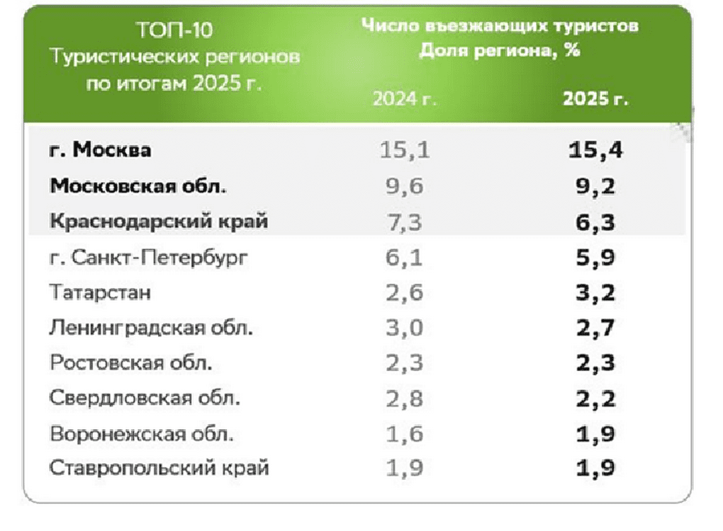 Наибольший прирост доли туристов показали Татарстан (на 0,6 процентных пункта), Крым (+0,5 п. п.), Москва (+0,3 п. п.), Воронежская область (+0,3 п. п.) и Хабаровский край (+0,2 п. п.).