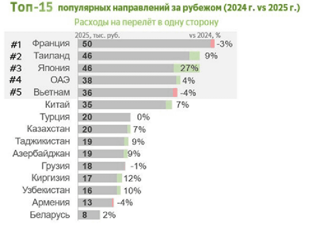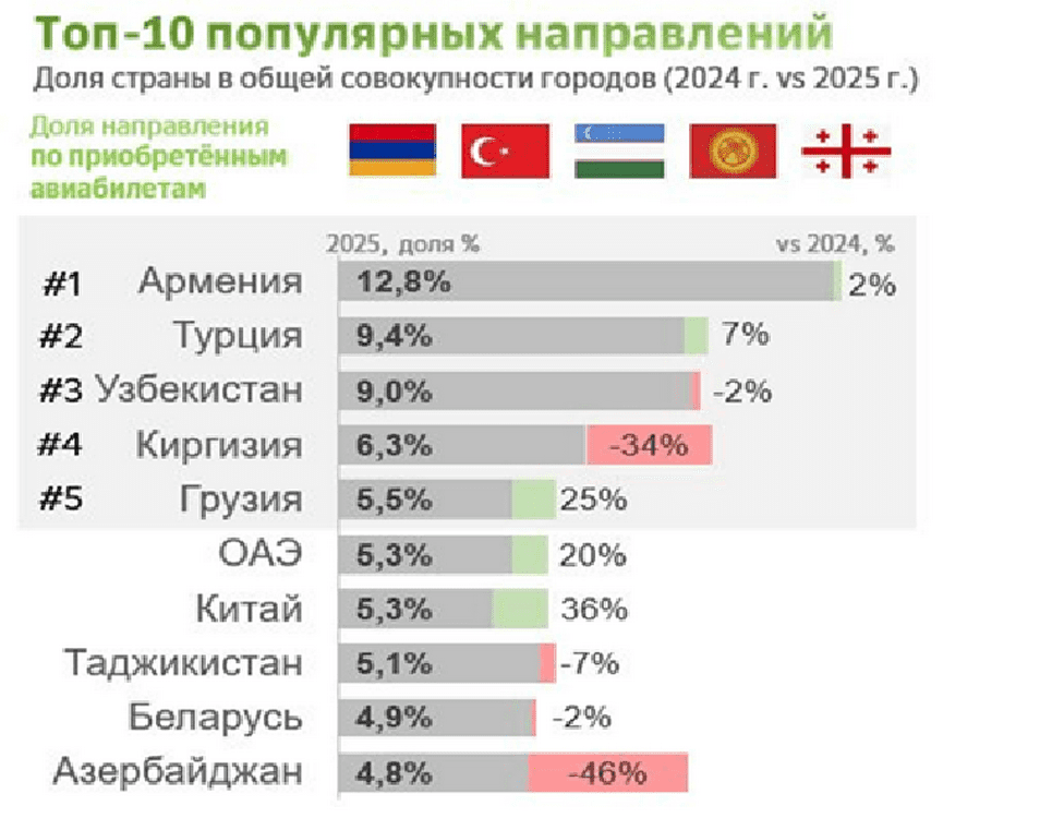 Интерес к зарубежным поездкам усилился. В 2025 году за границу отправился каждый четвёртый российский турист против каждого пятого в 2024 году. Доля международных авиабронирований выросла на 14%, а бронирований отелей – на 15%. В списке зарубежных направлений лидируют Закавказье (Армения, Грузия), ОАЭ, Китай и Турция. А вот популярность Центральной Азии у российских туристов снизилась.