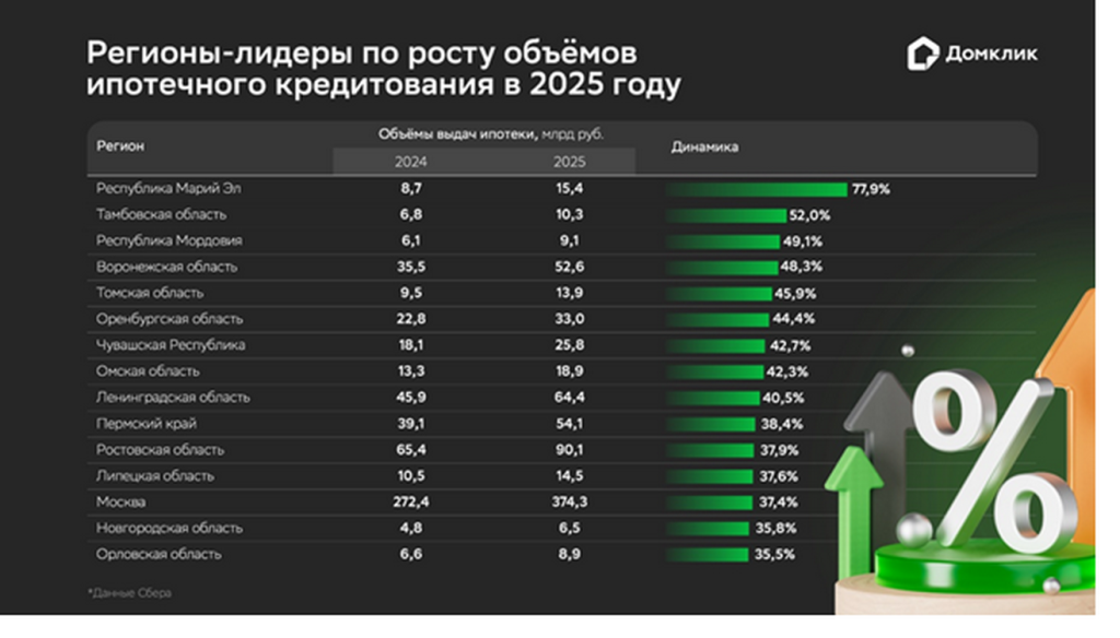 Лидером стала Республика Марий Эл, где объёмы выдач ипотеки в Сбере год к году выросли почти на 78%. Также в топ-3 вошли Тамбовская область (52%) и Республика Мордовия (49,1%).