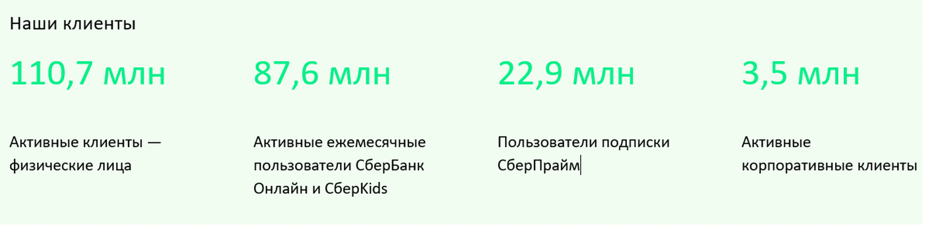 Количество розничных клиентов выросло на 0,2 млн за месяц или на 0,8 млн с начала года до 110,7 млн человек. Число активных корпоративных клиентов составило 3,5 млн компаний (+6,2% с начала года).