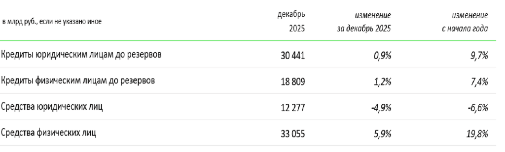 Стоимость кредитного риска без учета влияния изменения валютных курсов составила 1,5% за 12 месяцев 2025 г. и 1,9% в декабре (1,6% за декабрь 2024 г. и 1,5% за 12 месяцев 2024 г.).