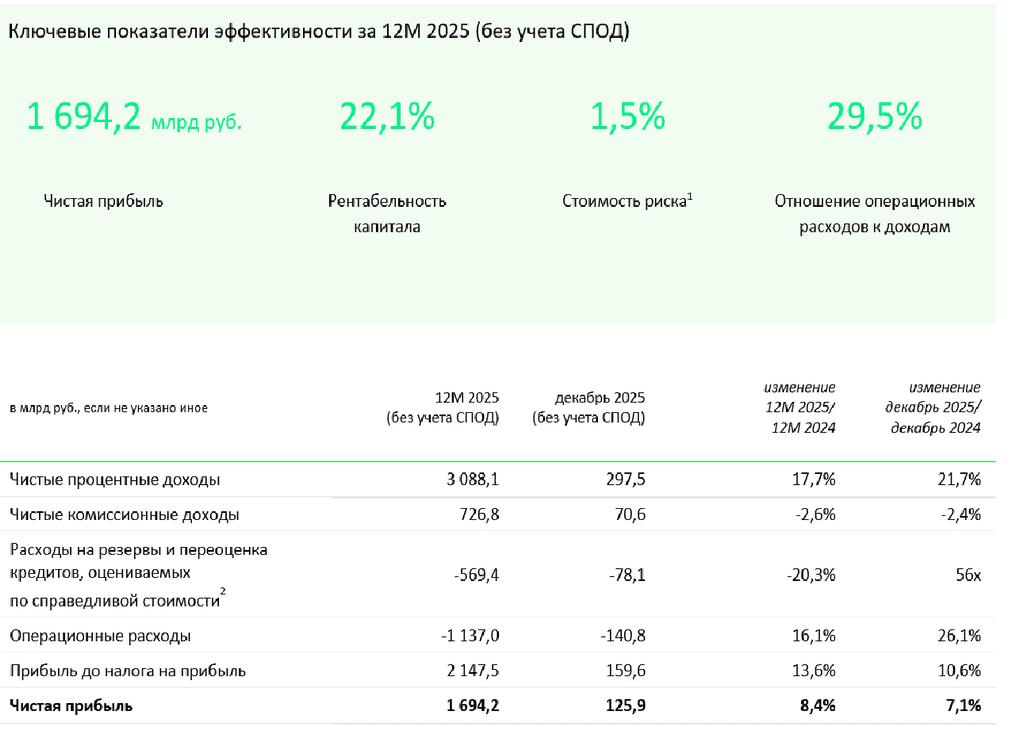 «Сегодня мы подводим итоги работы ПАО Сбербанк за 2025 год. За 12 месяцев чистая прибыль Банка выросла на 8,4% г/г до 1 694,2 млрд рублей при рентабельности капитала 22,1%. В декабре Банк заработал 125,9 млрд рублей чистой прибыли (+7,1% г/г).