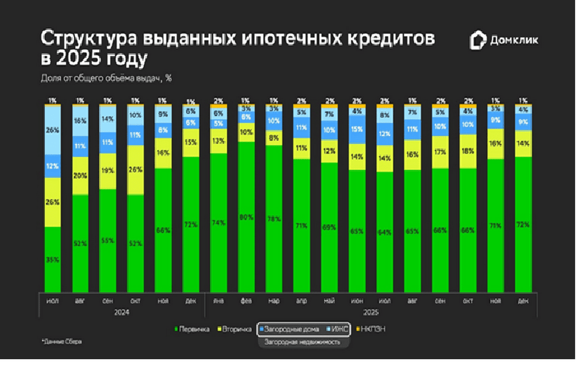 С марта 2025 года Домклик начал переход на новую систему учета объёмов выдач по продуктам. Наибольшие изменения затронули вторичное жилье. Во-первых, из этого сегмента в первичное жилье перенесли выдачи по договору купли-продажи от застройщика. Во-вторых, готовое загородное жилье, которое ранее относилось ко вторичному рынку, теперь считается частью сегмента загородной недвижимости.