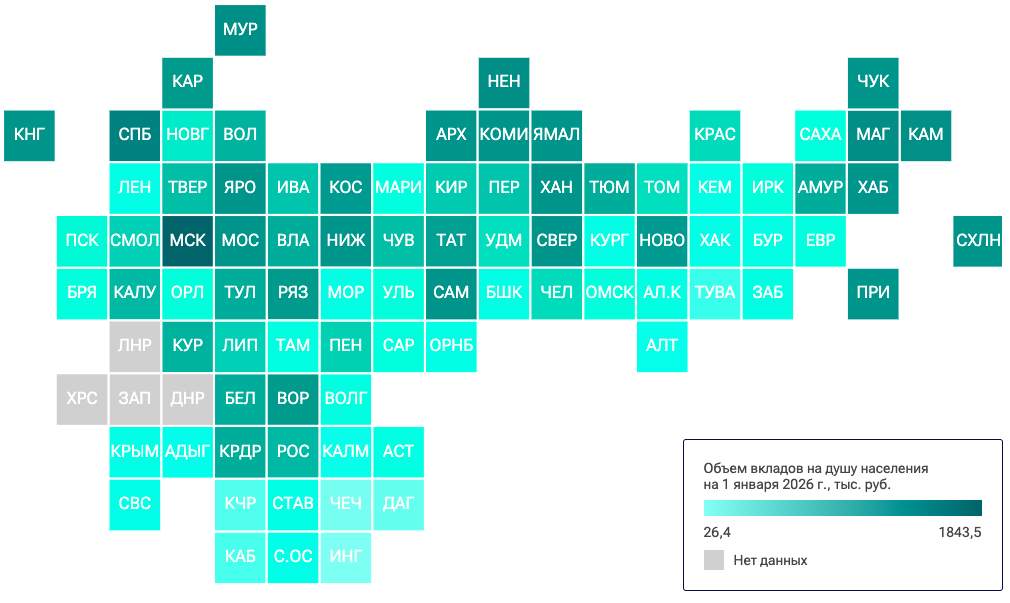 По данным аналитиков, по состоянию на 1 января 2026 года в регионе объем вкладов на душу населения составляет 268,4 тысяч рублей. В прошлом году прирост вкладов составил 20,9%.