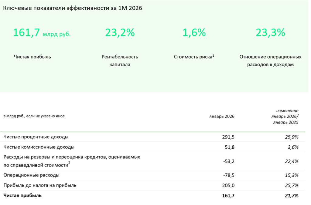 «В январе 2026 года Сбер заработал 161,7 млрд рублей чистой прибыли, что на 21,7% больше аналогичного периода прошлого года.