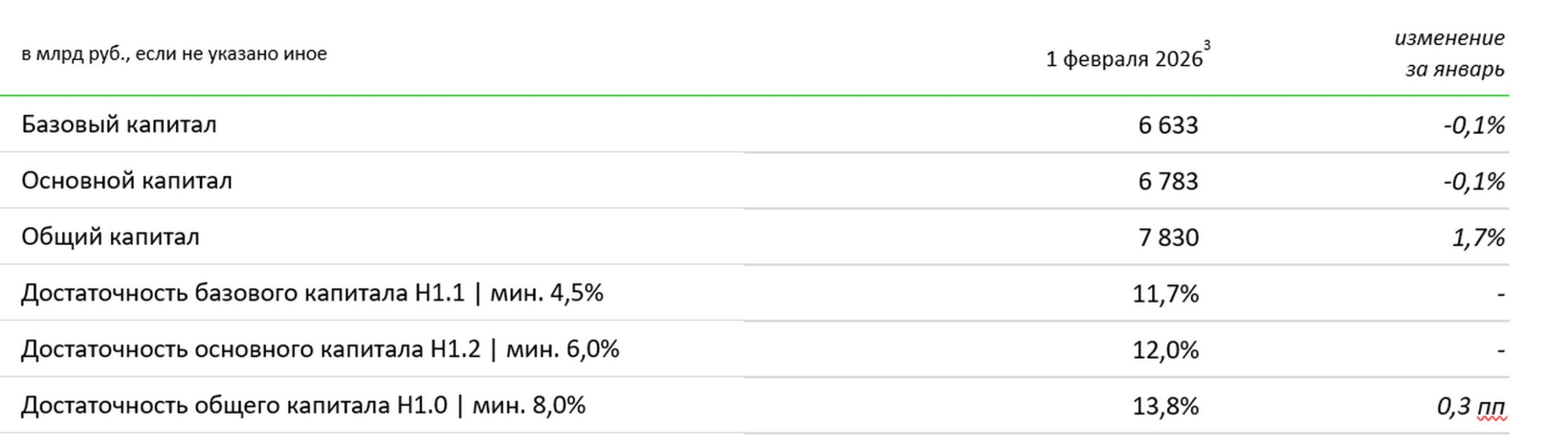 Расчет нормативов базового и основного капитала не учитывает прибыль за период с октября по декабрь 2025 г. и январь текущего года до проведения аудита. Расчетное влияние проаудированной прибыли за 4 месяца на нормативы составляет порядка 1,1 пп.
