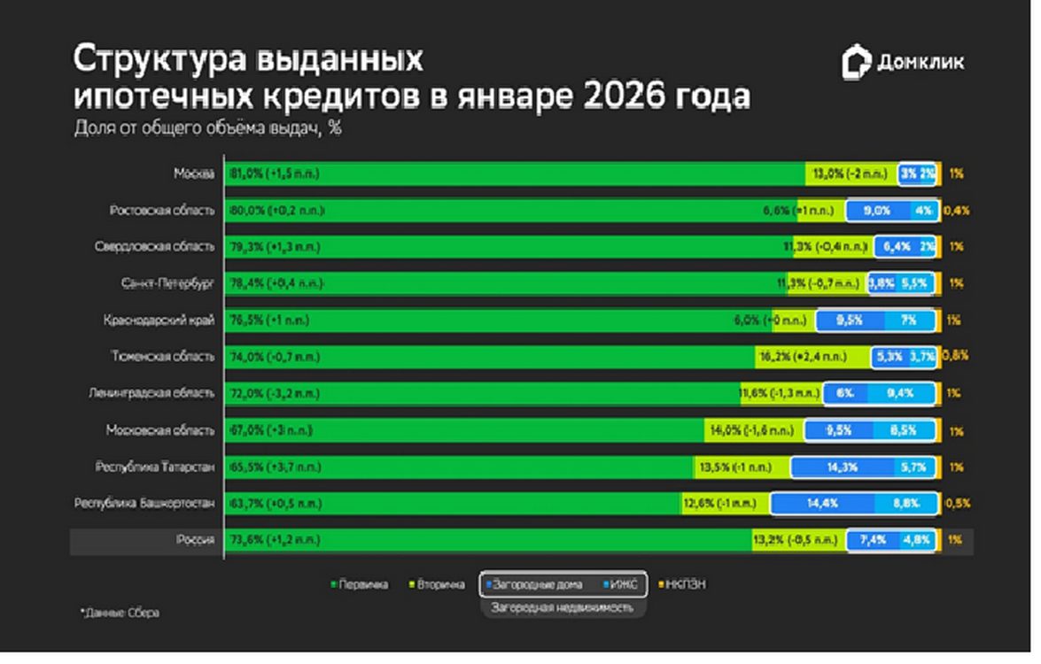 «В январе 2026 года Сбер выдал ипотеки на сумму 313,5 млрд рублей – в 4,7 раз больше, чем в январе 2025 года (67 млрд руб.). Наибольшая доля выдач у новостроек (73,6%), затем идут готовые квартиры (13,2%), а совокупная доля загородной недвижимости от общей суммы выдач достигла 12,2%.