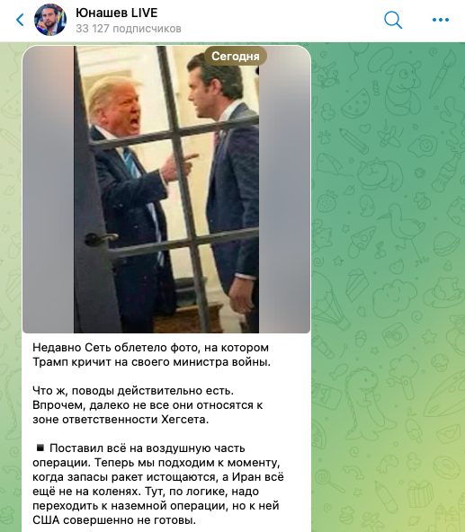 Журналист кремлевского пула Александр Юнашев опубликовал и прокомментировал фото, на котором видно, как президент США Дональд Трамп кричит на министра войны Пита Хегсета. У Вашингтона что-то идет не так? Иран даже не думает сдаваться.